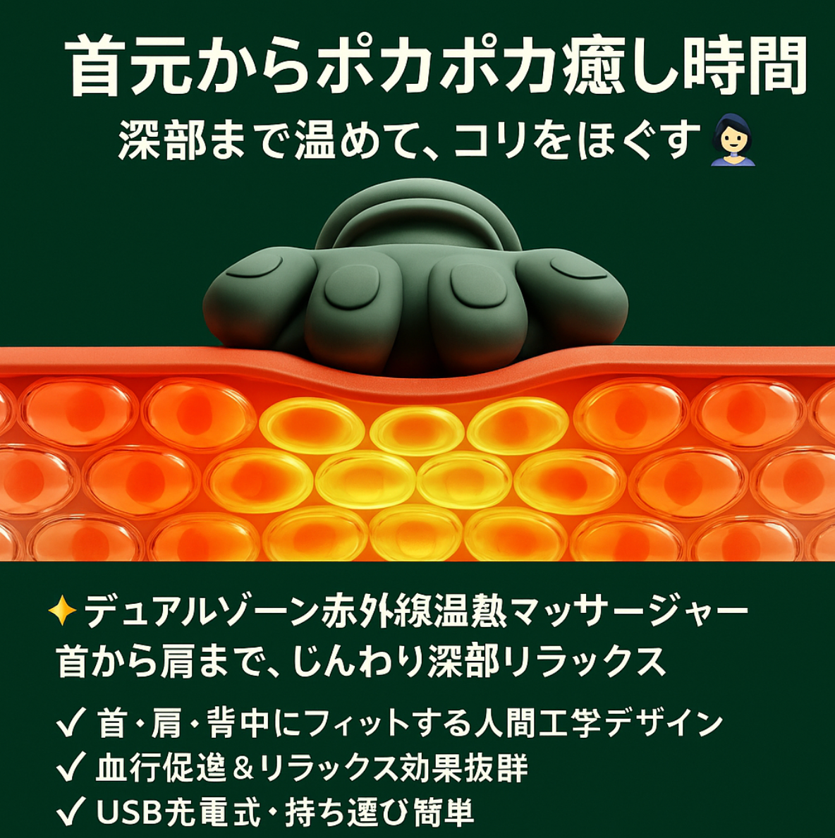 疲れた首や肩を、まるで温かい手で包み込むようにケア。